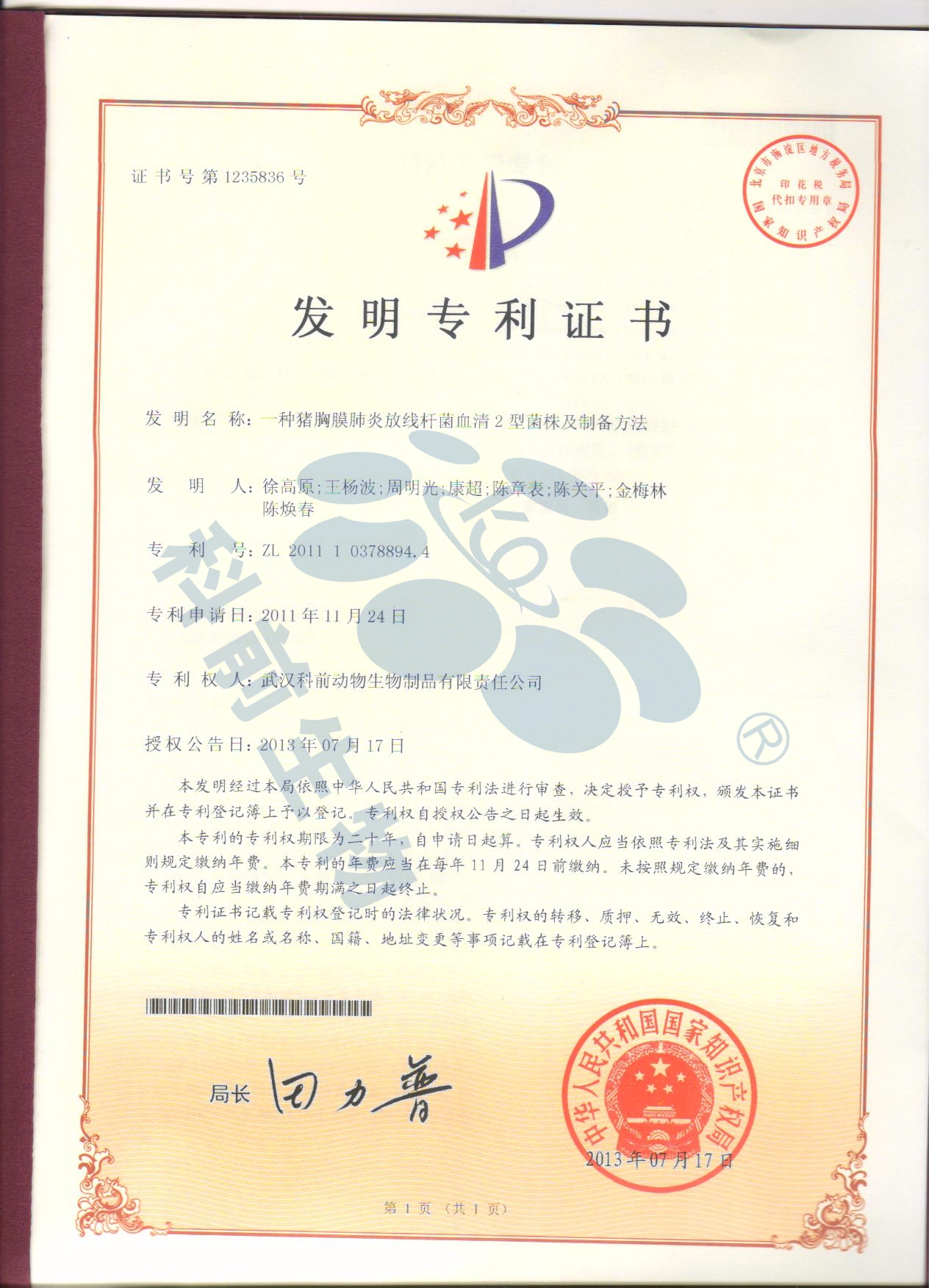 2013年專利證書