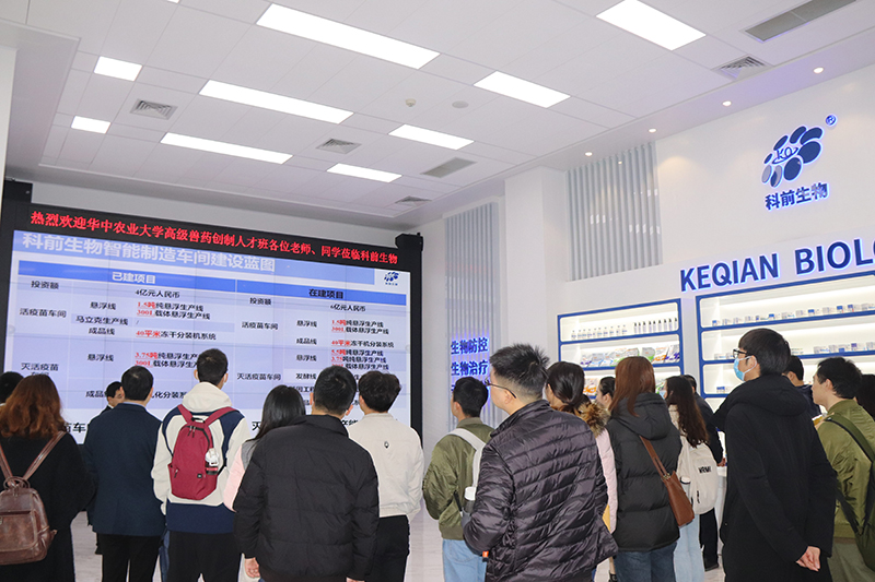 12月15日上午,華中農(nóng)業(yè)大學(xué)動科動醫(yī)學(xué)院副院長晏向華教授、高級獸藥創(chuàng)制人才班班主任王湘如教授、指導(dǎo)教師張悅老師率19名人才班學(xué)員蒞臨科前生物參觀交流。公司董事長陳煥春院士及全體在漢高管熱情接待了來訪師生。