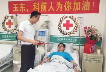 619日上午,一場生命接力的捐獻在河南省腫瘤醫(yī)院順利完成。為了救助一名在山東住院的白血病患者,來自武漢科前生物股份有限公司的張玉東,全身換血一周半,流通血液12000ml,其血液被專業(yè)設(shè)備分離出干細胞300ml,這些“生命的種子”將立即從鄭州送往濟南。捐獻后,張玉東身體狀況良好。